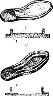 Специальная обработка основных стелек включает в себя дублирование тонких стелек полустелькой для их упрочнения, утонение стелек в носочно-пучковой части для увеличения гибкости обуви, соединение стелек с теленком. Кроме этого, стельки для рантовой обуви подвергают специальной обработке с целью получения натуральной или искусственной губы. Губа - это выступ, к которому пришивают рант вместе с затяжной кромкой заготовки. Для получения натуральной губы кожаную стельку подрезают с торцевой стороны на глубину 5-7 мм, подрезку поднимают в вертикальное положение (на угол 90° к поверхности стельки) и обклеивают прочной тканью, чтобы закрепить подрезку в вертикальном положении (рис. 5.5а). Толщина кожаной стельки для получения натуральной (подрезной) губы должна быть не менее 2,8 мм. Искусственную губу получают путем формования из ткани (например, трехслойной кирзы) или плотной тесьмы. Предварительно отформованную губу наклеивают на кожаную стельку толщиной менее 2,8 мм или на картонный слой, сдублированный с кожаной стелькой (рис. 5.56 и 5.5в).