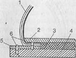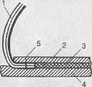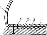 | Рис. 5,16. Схема клеевого метода крепления низа обуви (при гвоздевой затяжке кромки заготовки на основную стельку): 1 - заготовка верха, 2 - основная стелька, 3 - простилка, 4 - подошва, 5 - затяжной текс (гвоздь) |