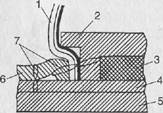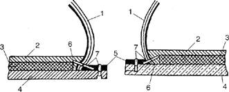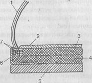 | Рис. 5.19. Схема рантово-клесвого метода крепления низа обуви: 1 - заготовка верха, 2 - основная стелька с губой, 3 - простилка, 4 - подложка (первый слой подошвы), 5 - подошва (второй слой подошвы), 6 - несущий рант, 7 - ниточные швы |
