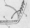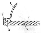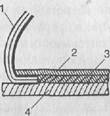 | Рис. 5.17. Схема клеевого метода крепления низа обуви (при клеевой затяжке кромки заготовки на основную стельку): 1 - заготовка верха, 2 - основная стелька, 3 - простилка, 4 - подошва |