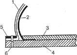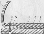| Рис. 5.11. Схема метода крепления низа обуви "Парко": 1 - заготовка верха, 2 - основная стелька, 3 - простилка, 4 - подошва, 5 - несущий рант, б - ниточные швы |
