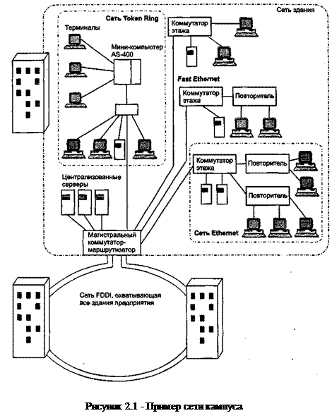 Главными особенностями сетей кампусов являются следующие (рис. 2.1). Сети этого типа объединяют множество сетей различных отделов одного предприятия в пределах отдельного здания или в пределах одной территории, покрывающей площадь в несколько квадратных километров.