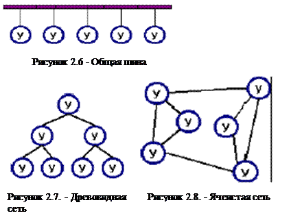 Древовидная сеть (рис.2.7). Сеть, которая содержит более двух оконечных узлов и, по крайней мере, два промежуточных узла, и в которой между двумя узлами имеется только один путь.