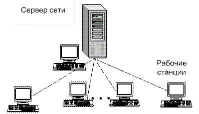При создании сети, в которой используются только сетевые адаптеры без таких средств, как маршрутизаторы, концентраторы и т.п., может быть реализована одна из трех сетевых топологий: звездообразная, шинная или кольцевая. Звездообразная сеть (рис. 6.2) характеризуется наличием центрального узла коммутации — сетевого сервера, к которому (или через который) посылаются все сообщения. В этом случае на сетевой сервер, кроме основных функций, могут быть возложены дополнительные функции по согласованию скоростей работы станций и преобразованию протоколов обмена, это позволяет в рамках одной сети объединять разнотипные рабочие станции.