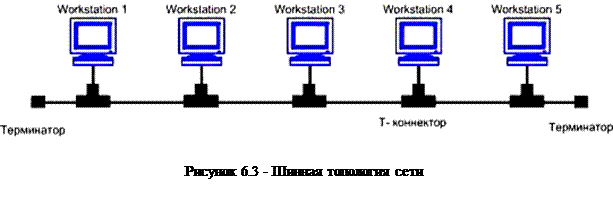 В сетях с шинной топологией (рис. 6.3) рабочие станции с помощью сетевых адаптеров подключаются к общей магистрали (шине), Аналогичным образом к общей магистрали подключаются и другие сетевые устройства.).