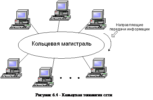Кольцевая сеть (рис. 6.4) характеризуется наличием замкнутого однонаправленного канала передачи данных в виде кольца или петли. В этом случае информация передается последовательно между адаптерами рабочих станций до тех пор, пока не будет принята получателем и затем удалена из сети. Обычно за удаление информации из сети отвечает ее отправитель. Управление работой кольцевой сети может осуществляться централизовано с помощью специальной мониторной станции, либо децентрализовано за счет распределения функций управления между всеми рабочими станциями. Недостатком кольцевой топологии является то, что отказ одного звена кольца может вывести из строя всю локальную сеть. С целью повышения надежности кольцевых структур используют специальные безразрывные коммутаторы, позволяющие автоматически отключать неработающие компьютеры или отдельные сегменты сети.