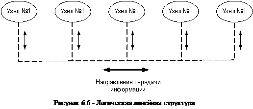 Логический канал задает последовательность передачи информации рабочими станциями. При этом логическая организация не всегда совпадает с топологией сети. В рамках локальных сетей различают линейные и кольцевые логические каналы. При линейной логической организации (рис. 6.6) все узлы локальной сети связаны между собой с помощью обшей логической шины. В этом случае информация от узла поступает на общую логическую шину, затем, в зависимости от адреса получателя, поступает на один из узлов локальной сети. Подобная организация соответствует линейной физической структуре, представленной на рис. (6.6). Это наиболее простой вид логической организации, как правило, не требующий специального управления. Подобное сочетание физической и логической структуры используется в широко известных сетях Ethernet.