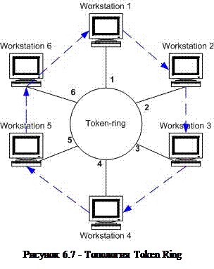 При кольцевой логической организации используется специальная управляющая информация, например, в виде маркера, который последовательно передается между узлами сети. При поступлении маркера узел получает возможность передавать информацию в физическую среду. Кольцевая логическая организация может использоваться не только в кольцевой, но и в линейной физической структуре локальных сетей.