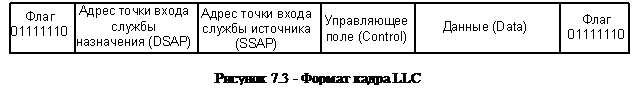 Ненумерованные кадры (Unnumbered) предназначены для передачи ненумерованных команд и ответов, выполняющих в процедурах без установления логического соединения передачу информации, идентификацию и тестирование LLC-уровня, а в процедурах с установлением логического соединения LLC2 — установление и разъединение логического соединения, а также информирование об ошибках. Все типы кадров уровня LLC имеют единый формат представленный (рис. 7.3):
