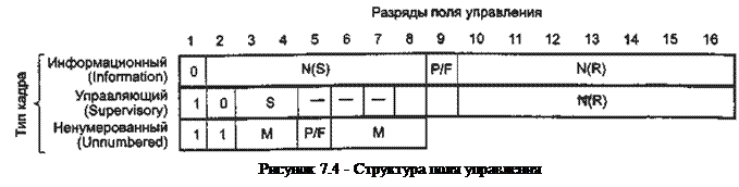 Поле управления (1 или 2 байта) имеет сложную структуру при работе в режиме LLC2 и достаточно простую структуру при работе в режиме LLC1 (рис. 7.4).