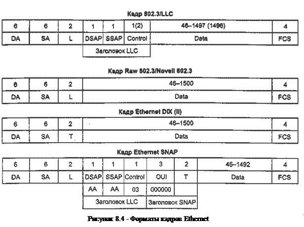 Кадр 802.3 является кадром МАС-подуровня, поэтому в соответствии со стандартом 802.2 в его поле данных вкладывается кадр подуровня LLC с удаленными флагами начала и конца кадра. Формат кадра LLC был описан выше. Так как кадр LLC имеет заголовок длиной 3 (в режиме LLC1) или 4 байт (в режиме LLC2), то максимальный размер поля данных уменьшается до 1497 или 1496 байт.