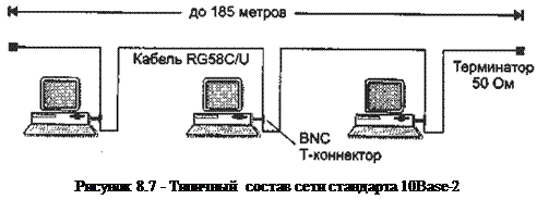Типичный состав сети стандарта 10Base-2, состоящей из одного сегмента кабеля, показан (рис. 8.7).