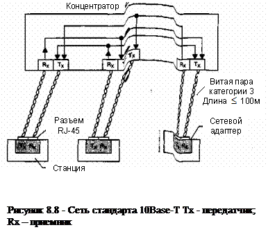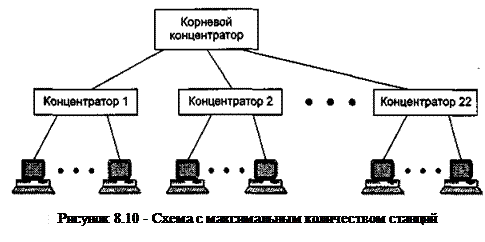 Для обеспечения синхронизации стаций, реализации процедур доступа CSMA/CD и надежного распознавания коллизий в стандарте определено максимально число концентраторов между двумя станциями сети, а именно 4. Это правило носит название «правила 4-х хабов» и оно заменяет «правило 5-4-3», применяемое к коаксиальным сетям. При создании сети 10Base-T с большим числом станций концентраторы можно соединять друг с другом иерархическим способом, образуя древовидную структуру (рис. 8.9).