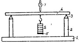 Экспериментальная установка /рис.5/ состоит из массивной стальной балки 1 со стойками 2. На концах стоек установлены опорные призмы 3, на которые опирается исследуемый стержень 4.К середине исследуемого стержня крепится держатель с площадкой 5, на которую навешиваются грузы 6.Изгиб стержня определяется с помощью индикатора часового типа 7 или с помощью микрометрического винта с электрической системой индикации.