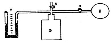 Лабораторная установка (рис.1) состоит из стеклянного баллона Б, закрытого пробкой. В пробку вставлен стеклянный четверник, с помощью которого баллон соединен с манометром М, насосом Н и атмосферой (кран К). В шланг, соединяющий баллон с насосом, вставлен кран П, служащий для прекращения выхода воздуха после накачивания его в баллон.