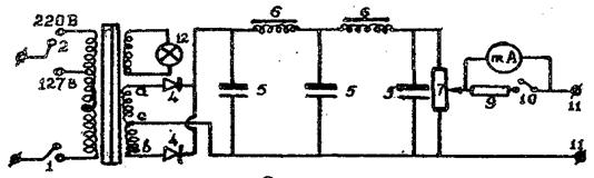 В принципиальную схему аппарата, которая изображена на рис.2, входят: трансформатор 3; два диода 4, служащих для выпрямления переменного тока; сглаживающий электрический фильтр, состоящий из трех электролитических конденсаторов 5 и двух дросселей 6; потенциометр 7; миллиамперметр 8 с шунтом 9; клеммы 11; переключатель шунта 10.