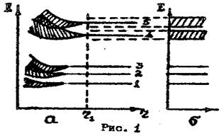 Ввиду этого энергетический спектр электронов изолированного атома является дискретным. Энергия электронов соответствует определенным энергетическим уровням, значение энергий между которыми являются запрещенными для электронов. Такие уровни показаны в правой части рис.1, а в виде отдельных линий 1-5. На этом рисунке по оси ординат отложены значения энергии Е. электронов, а по оси абсцисс – расстояние между атомами. При больших расстояниях атомы независимы друг от друга и их энергетические уровни одинаковы.