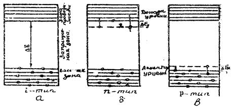 С энергетической точки зрения этот переход эквивалентен переходу электрона из заполненной валентной зоны кристалла на энергетический уровень примеси (рис 2 в). Этот переход освобождает один из уровней в верхней части валентной зоны, создавая в ней дырку, при этом ΔЕа<< ΔЕ (ΔЕа - энергия, отделяющая акцепторные уровни от зоны проводимости). Примеси такого рода называются акцепторными (принимающими электроны), проводимость называется дырочной, а полупроводник р – типа.
