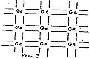 Рассмотрим механизм влияния примесей на электропроводность полупроводников. Допустим, что в германий внесены примеси мышьяка, атомы которого имеют, пять валентных электронов. Каждый атом германия связан (рис. 3) ковалентными связями с четырьмя ближайшими соседями, образуя устойчивую оболочку из восьми электронов. Если в кристалле атомы германия будут частично заменены атомами мышьяка, то четыре из его пяти валентных электронов заполнят валентные связи с четырьмя соседними атомами германия, а пятый окажется лишним. Он перейдет на примесный уровень (рис. 2,б), расположенный у дна зоны проводимости. При этом ΔЕg<<ΔЕ, благодаря чему при небольших внешних воздействиях (ΔЕg – энергия, отделяющая донорные уровни от зоны проводимости) концентрация примесных электронов, поставляемых примесными атомами в зону проводимости, превзойдет концентрацию собственных носителей. Подобного типа примеси и образованные ими уровни получили название донорных уровней (отдающих электроны). Такая проводимость называется электронной, а проводник – n типа.