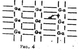 Если часть атомов германия заменить атомами одного из элементов третьей группы периодической системы элементов, например, индия, то трех его валентных электронов не хватит (рис.4) для заполнения валентных связей с соседними атомами германия. Образуется вакантная связь, которая может быть заполнена за счет перехода на вакансию электрона из любой заполненной связи.