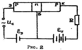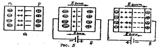 Если рассматриваемую систему включить в электрическую цепь так, чтобы внешнее поле было направлено против поля на границе (рис. 5, б), то электроны и дырки начнут двигаться навстречу друг другу, уменьшая ширину двойного электрического слоя и по цепи пойдет ток, сила которого быстро возрастает при увеличении приложенного напряжения. Такое включение р-n – перехода называется прямым, а проходящий ток – прямым или пропускным током.