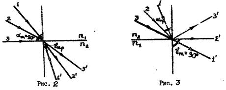 Если свет переходит из оптически более плотной среды в оптически менее плотную среду: n2 > n1, (рис. 3), то угол преломления больше угла падения (луч 1-1,). Угол преломления γm = 90о (луч 2-2,) соответствует углу падения αпр. Если свет падает под углом больше предельного, то он полностью отражается от границы сред (луч 3-3,). Это явление называется полным внутренним отражением. Угол падения называется предельным углом полного внутреннего отражения.