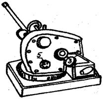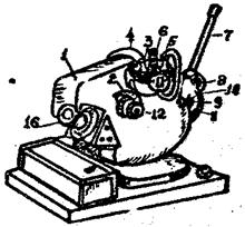 На оси прибора укреплены: рукоятка 11 с окуляром 10 и настроечным механизмом 14, облегчающим совмещение границы светотени с перекрестием сетки лимб дисперсии 7 для устранения окрашенности границы светотени, наблюдаемой в окуляр; механизм наведения, находящийся внутри корпуса, который вместе с рукояткой может поворачиваться на оси вдоль шкалы. Для фиксации положения границы светотени относительно неподвижной шкалы 9 окуляр 10 вращается относительно оси рукояткой 11. Через окуляр 10 зрительной трубы наблюдается граница светотени, перекрестие сетки и шкалы.