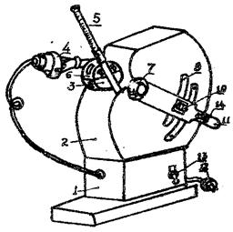Нижняя и верхняя части камеры имеют окна, закрывающиеся пробкой. На передней стенке основания имеется выключатель 13 для включения осветителя, а на боковой стенке – шнур с вилкой 12 для подводки питания от сети.