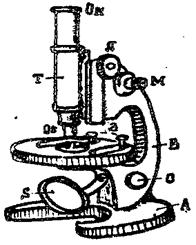 Микроскоп состоит из двух частей: механической и оптической. Механическая часть (рис.2) состоит из основания А, колонки тубусодержателя В, тубуса Т, кремальеры с ведущим барашковым колесиком Д. тубус перемещается вдоль оси микроскопа при помощи зубчатой рейки колесиком Д. и микрометрическим винтом М, обеспечивающий грубую и точную подачу тубуса для наводки на резкость изображения. Для удобства наблюдений тубусодержатель может поворачиваться до горизонтального положения вокруг оси О. На предметном столике П с помощью зажима З закрепляются исследуемые объекты (препараты). В центре предметного столика имеется круглое отверстие. Часто на предметном столике укрепляют препаратоводитель.