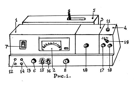 На передней стенке камеры 4 расположена рукоятка 17 шторки, рукоятка 18 установки нуля, рукоятка 19 установки чувствительности.