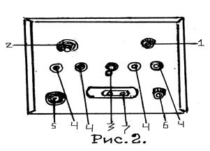 Ось 1 резистора для регулировки разрядного тока, ось 2 резистора для регулировки рабочего тока накала дейтериевой лампы, тумблер 3 и клеммы 4 для включения амперметра в цепь стабилизатора при установке разрядного тока и для включения амперметра в цепь накала дейтериевой лампы при установке рабочего тока накала лампы, предохранитель 5, клемма 6 для заземления и сетевая розетка 7.