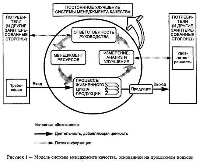На рисунке 1 приведена основанная на процессном подходе система менеджмента качества, описанная в семействе стандартов ИСО 9000. Он показывает, что заинтересованные стороны играют существенную роль в предоставлении организации входных данных. Наблюдение за удовлетворенностью заинтересованных сторон требует оценки информации, касающейся восприятия заинтересованными сторонами степени выполнения их потребностей и ожиданий. Модель, приведенная на рисунке 1, не показывает процессы на детальном уровне.
