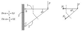 Это метод, который позволяет определять N в сложных конструкциях типа стержневой системы, например, фермы. Суть метода рассмотрим на простом примере, приведенном на рис.2.3.1. Пусть длины стержней l1=4 м, l2=5 м, ВС =3м. Тогда