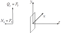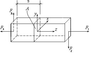 Для простоты будем использовать термин «правая часть бруса». Согласно рис.3.1, это та часть, которая находится со стороны конца оси z, (другую часть будем называть «левой частью бруса»). На эту правую часть бруса воздействует левая часть бруса через внутреннее сечение А силами F3, F4 и моментом F3 s относительно оси x. Эти воздействия (т.е. силы и момент) называются внутренними силовыми факторами.