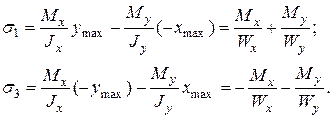 видно, что экстремальные напряжения возникают в точках сечения, наиболее удаленных от Н.О. Это будут т.1 и т.3. В них