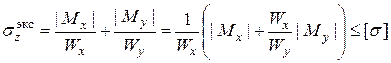 Для балок из пластичных материалов, одинаково работающих на растяжение и сжатие, условие прочности в опасном сечении бруса можно записать так с учетом (7.7)