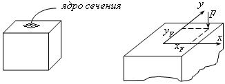Ядро сечения - это область, расположенная вокруг центра тяжести (рис.19.12), причем, такая, что если приложить продольную сжимающую силу в этой области, то нигде в стержне напряжение растяжения не возникнет, будет только сжатие.