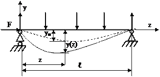 Рассмотрим нагружение прямого шарнирно закреплённого стержня продольной силой F и системой поперечных сил. Такой вид нагружения принято называть продольно- поперчным изгибом. Обозначим у(z) прогиб балки в сечении c абсциссой z. Воспользуемся дифференциальным уравнением упругой линии балки, в котором изгибающий момент можно рассматривать как сумму моментов поперечных сил