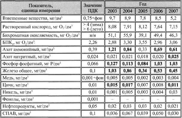 Основными загрязняющими веществами являются биогенные элементы, а также некоторые тяжелые металлы. В наибольшей степени речные воды загрязнены фосфатным фосфором, концентрации которого в течение последних пяти лет (2003–2007 гг.) варьировали в диапазоне от 2,2 до 15,6 ПДК.