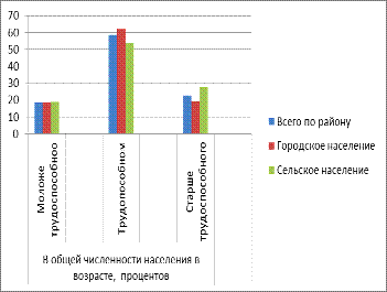 | (18,6%), в сельской местности – 6927 (18,8%). В трудоспособном возрасте находятся 51543 человека, из них в городе проживают 31771 или 62,1%, а в сельской местности 19772, что составляет 53,6%. Старше трудоспособного возраста – 20037 человек, что составило 22,8%, из них горожане –9865 (19,9%) и в сельской местности |