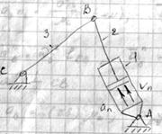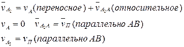 Рассматриваем движение звена “2” как сложное, которое складывается из переносного (вращательного) движения вместе со звеном “1” и относительного (поступательного) по отношению к звену “1”: