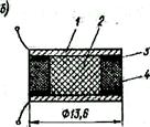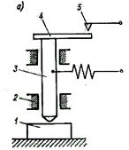 В измерительной технике в цепях коммутации широко применяются магнитоуправляемые контакты, называемые герконами. В стеклянном баллоне, имеющем диаметр около 3 мм и длину около 20 мм, помещаются контактные пластины. Переключаемые токи составляют 5×10-6 – 0,5 А при напряжениях до 220 В. Исследования, проведенные Я.В. Петерсоном, показали, что сопротивление между контактами в замкнутом состоянии не превышает 0,1 Ом, в разомкнутом состоянии – не менее 109 Ом, емкость между контактами 0,4 пФ, индуктивность 0,5–1,5 мкГн. При замыкании контактов наблюдается в среднем шесть отскоков и время дребезга контактов составляет 100–120 мкс. Дребезг контактов приводит к возникновению дополнительного шума. Кроме того, при наличии разницы температур между выводами контакта приходится учитывать термо-ЭДС, которая составляет около 40 мкВ при температурном градиенте 1 К. Преобразователи контактного сопротивления основаны на изменении под действием давления сопротивления между проводящими элементами, разделенными слоями полупроводящего материала. Преобразователь может быть выполнен в виде столбика из ряда слоев электропроводящей бумаги, электропроводящей резины или металлических пластин, на которые путем напыления нанесен высокоомный резистивный слой. Преобразователи контактного сопротивления имеют большие погрешности гистерезиса и линейности (до 10%), но очень просты конструктивно, имеют высокую надежность и достаточную выходную мощность. На рис.2-8, б показана схематическая конструкция преобразователя, применяемого в биоэлектрическом протезе, где 1 – электрод; 2 – электропроводящая пластина; 3 – клей; 4 – изолятор из резины. При изменении давления от 0 до 105 Па сопротивление изменяется от 100 до 2 кОм при деформации чувствительного элемента до 50%, допустимая мощность рассеяния 0,5 Вт. Подобные преобразователи используются в тактильных датчиках роботов и манипуляторов.