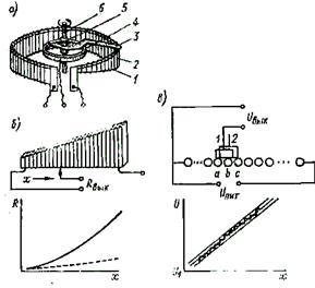 На рис.2-9, а показано устройство реостатного преобразователя. На каркас 1 из изоляционного материала намотана с равномерным шагом проволока 2. Изоляция проволоки на верхней грани каркаса зачищается, и по металлу проволоки скользит щетка 3. Добавочная щетка 5 скользит по токосъемному кольцу 4. Обе щетки изолированы от приводного валика 6.
