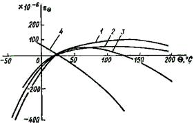 ТКС константана в зависимости от примесей в сплаве может иметь любое значение в пределах ±30·10-6 К-1, причем в относительно небольшом интервале температур заданное значение ТКС обеспечивается с погрешностью ±(0,5–1)·10-6 К-1. Это позволяет для многих материалов объектов измерения (сталь, нержавеющая сталь, сплавы алюминия) изготовлять термокомпенсированные тензорезисторы. Кажущаяся деформация изменяется с температурой примерно так, как показано на рис. 2-12 для термокомпенсированных тензорезисторов, наклеенных на сталь (кривая 1), алюминий (кривая 2) и нержавеющую сталь (кривая 3); здесь же для сравнения приведена кривая 4 температурной погрешности тензорезистора, предназначенного для наклейки на нержавеющую сталь, а наклеенного на сталь. Для термокомпенсированных тензорезисторов величина кажущейся деформации в диапазоне температур 20–100°С не превышает DeΘ=1,5·10-6 К-1, что при измеряемой деформации el=10-2 приводит к температурной погрешности нуля 0,00015 К-1.
