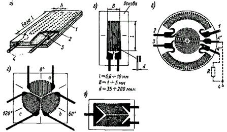 Конструкции и технические характеристики дискретных металлических и полупроводниковых тензорезисторов. Устройство наиболее распространенного типа наклеиваемого проволочного тензорезистора изображено на рис. 2-13, а. На полоску тонкой бумаги или лаковую пленку 2 наклеивается так называемая решетка из зигзагообразно уложенной тонкой проволоки 3 диаметром 0,02–0,05 мм. К концам проволоки присоединяются (пайкой или сваркой) выводные медные проводники 4. Сверху преобразователь покрывается слоем лака 1. Такой преобразователь, будучи приклеенным к испытуемой детали, воспринимает деформации ее поверхностного слоя. Измерительной базой преобразователя является длина детали, занимаемая проволокой. Наиболее часто используются преобразователи с базами 5–20 мм, обладающие сопротивлением 30–500 Ом.
