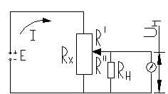 При изменении сопротивления резистивного преобразователя Rx изменяется ток Iр в цепи и следовательно показания прибора ИП. Достоинства: простота схемы