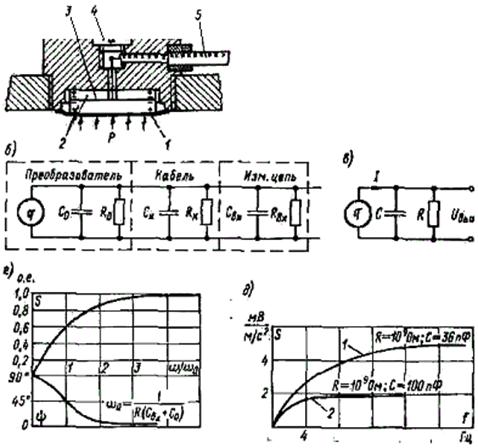 Для расширения частотного диапазона измеряемых величин в сторону низких частот, очевидно, следует увеличить постоянную времени цепи t = RC. Для того чтобы получить представление о значениях сопротивлений и емкостей, на рис. 2-16, д приведены кривые 1 и 2 чувствительности пьезоэлектрического акселерометра в функции частоты для различных сочетаний R и С. Расширение частотного диапазона путем увеличения емкости С (кривая 2) легко осуществляется включением параллельно преобразователю конденсаторов, однако это приводит к уменьшению выходного напряжения преобразователя. Увеличение сопротивления R приводит к расширению частотного диапазона без потери чувствительности, но повысить сопротивление можно только путем улучшения качества изоляции и применения усилителей с высокоомным входом.