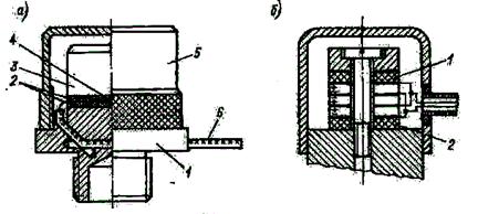 На рис. 2-17, а представлена конструкция пьезоэлектрического датчика ускорений. Все элементы датчика крепятся к основанию 1,выполненному из титана. Преобразователь 2 состоит из двух включенных параллельно пьезоэлементов из кварца Х -среза. Инерционная масса 3 для уменьшения габаритов датчика изготовлена из легкообрабатываемого сплава ВНМЗ-2 с высокой плотностью 18 Мг/м3 (18 г/см3). Сигнал с кварцевых пластин снимается при помощи вывода из латунной фольги 4, соединенного с кабелем 6. Кабель крепится к основанию при помощи пайки. Датчик закрывается крышкой 5, навинчиваемой на основание. На основании 1 нарезана резьба для крепления датчика на объекте. Масса датчика 35 г, рабочий диапазон 1–150 м/с2.