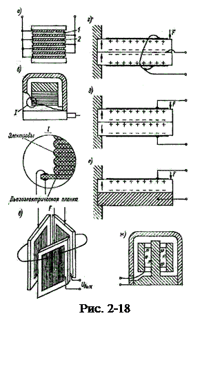 Высокую чувствительность имеют также преобразователи с пьезоэлементами, работающими на изгиб. Пьезоэлемент, называемый биморфным, составлен из двух пластин. При действии силы F пьезоэлемент прогибается, верхняя пластина испытывает растяжение, нижняя – сжатие и на пластинах наводятся заряды. Пластины в зависимости от направления положительных осей в них (оси указаны стрелками) могут соединяться как параллельно, так и последовательно, как это и показано на рис. 2-18, г и д; там же даны и знаки зарядов. Кроме этого, в качестве одной из пластин может быть использован не пьезоэлемент, а металлическая накладка такой толщины, чтобы пьезопластина лежала выше нейтрального слоя (рис. 2-18, е).