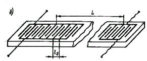 Для возбуждения ПАВ на поверхность пьезоэлемента наносятся гребенки встречно включенных электродов (рис. 2-22, б), представляющие собой встречно-штыревой преобразователь (ВШП), имеющий шаг l 0= l. При подключении напряжения к электродам ВШП под ними вследствие обратного пьезоэффекта происходят смещения частиц и возникает ПАВ, распространяющаяся в обе стороны. Если при этом длина волны совпадает с шагом ВШП, то вследствие суперпозиции колебаний, возникающих под каждой парой электродов, суммарная энергия ПАВ достигает максимума; если длина волны не совпадает с шагом ВШП, энергия ПАВ уменьшается и при определенном соотношении между l и l 0 волна за пределами ВШП может полностью погаситься.